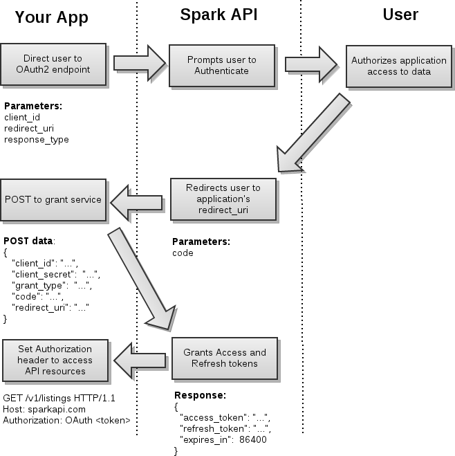 The typical OAuth 2 flow with Spark API can be broken down into four steps:
